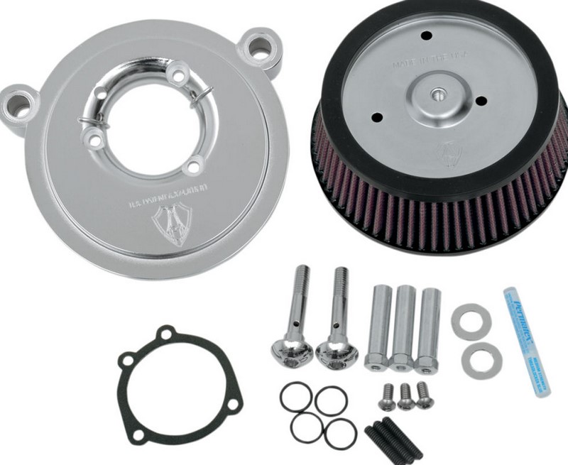 Big Sucker™ Air Filter Kit (Accepts 8" Round Aftermarket Covers Only)One-piece aluminum backing plate features patented hidden breather technologyEach hidden breather is O-ringed at the heads and exits at the mouth of the injector/carb to provide efficient engine breathing, eliminating the need for any external hoses or hardwareRadius air inlet provides maximum performance by providing unobstructed airflowBacking plates are available in natural, black powder coat, or chrome finishFilters are available with standard red or synthetic black filter elementsStandard red filters are pre-oiled, washable and feature four layers of surgical grade cotton for optimum filtration and maximum airflowSynthetic filters feature a black synthetic material that is water resistant and never needs to be oiled; just wash and re-useStage I kit accepts OEM outer cover (unless noted) or custom Ness outer coverStage II kit features a 20% larger filter element and accepts an 8" round Ness outer cover onlyAll necessary hardware and instructions are included with each kit