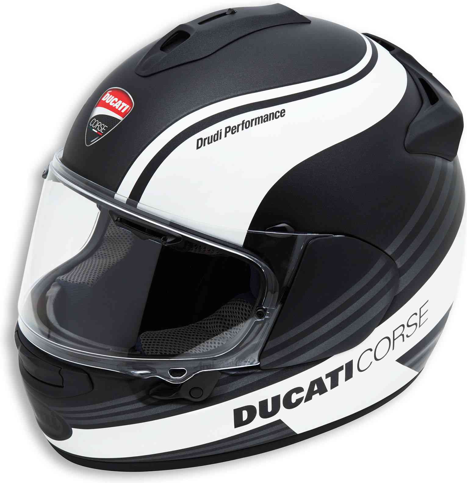 ドゥカティ・コルセSBK 3ヘルメットは、Arai Chaser-Xをベースに、ベンチレーションシステムを一新し、VASバイザーの導入により視野角を拡大しました。スーパーファイバー製のシェルは頑丈かつ軽量で、内部のチークパッドは顔にぴったりとフィットし、取り外して洗える内装は快適性に優れています。ドゥカティのためにDrudi Performanceが特別に開発したデザインは、レーストラックの雰囲気を即座に思い起こさせます。ヘルメットのカラーは、マット仕上げのブラックとグレーがあります。スポーツマン、スポーツウーマンに捧ぐ。