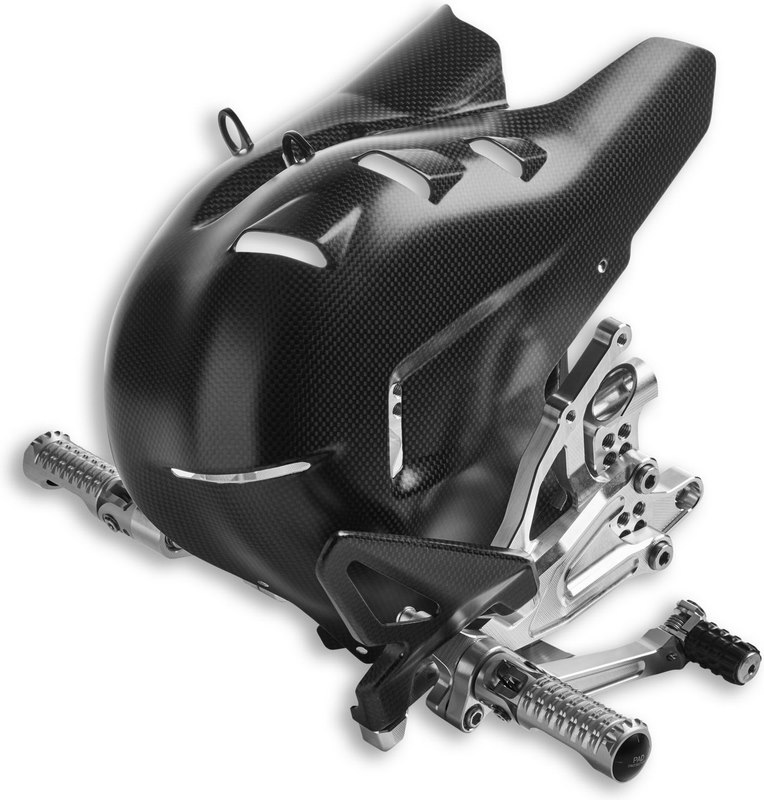 Developed thanks to the experience of Ducati Corse and the skilful productive care of Rizoma. Made of high quality anodised aluminium alloy that maintains its original appearance over time. Adjustable in multiple positions, they allow the rider to find the position that best suits their build and riding style. Equipped with fold-away brake and gearchange pedals to minimise the risk of breakage in the event of a slip. They use the standard DQS, which can be configured both as a traditional shift and as a reversed/racing shift. The kit also includes two heat protections in carbon fibre. An essential accessory for the most demanding riders who want to fully enjoy the Panigale experience.