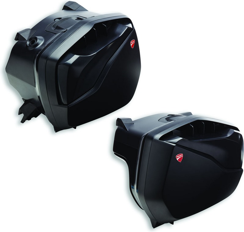 Accessory with captivating design and volumes designed to ensure maximum capacity, without affecting the dynamic lines of the Multistrada. The convenient feet on the bottom prevent them from tipping over once released from the bike. Made from high-quality materials to ensure waterproofing features and excellent durability.