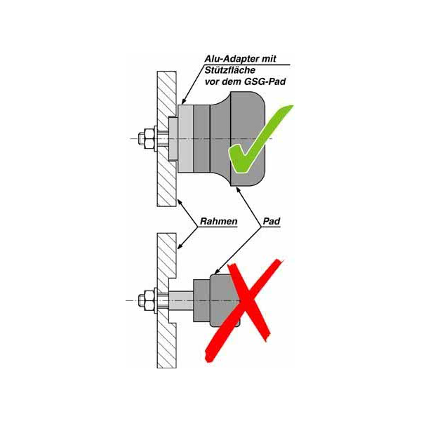 パッドの正しい装着を確実にするため、GSGパッドには、フレームやエンジンに直接接続される箇所に、プレススチールブッシュが装備されています。プラスチックは弾性のある素材であるため、スチールブッシュを使用しない場合、締め付けトルクは最大でも30Nmまでしか達成できず、エンジンが振動したまま走行することになります。転倒した場合、フレームアイには莫大な梃子の力が作用し、ネジ山は簡単に拡大したり、適切な箇所で裂けたりします)!