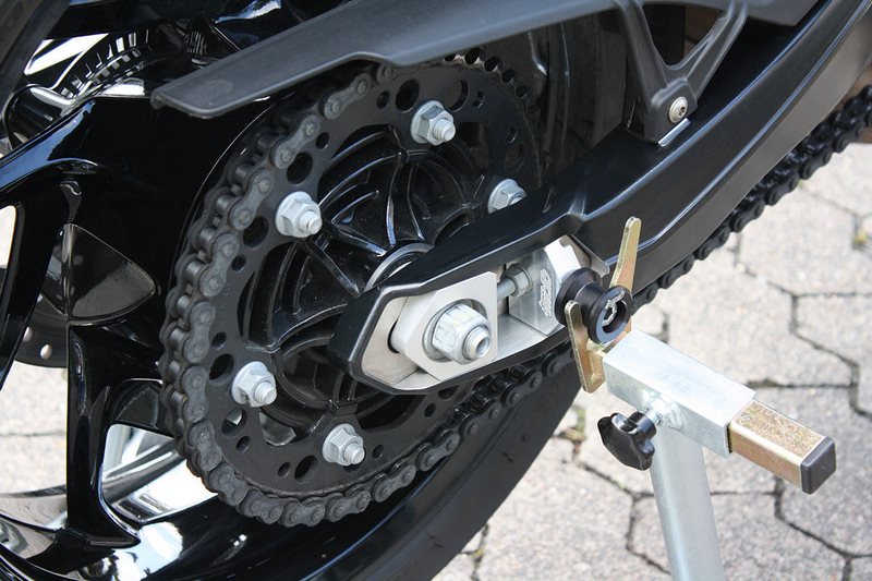 Jacking up and wheel removal easily possible. The base carrier locks into the swing arm profile and is held in place by the chain tensioning screw.