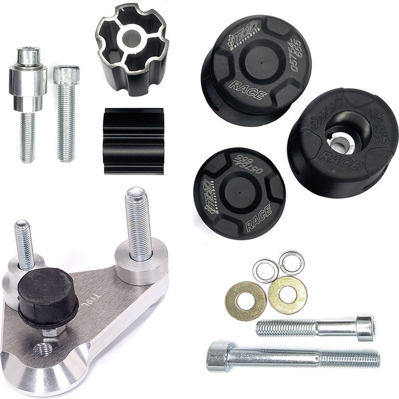 パッドの正しい装着を確実にするため、GSGパッドには、フレームやエンジンに直接接続される箇所に、プレススチールブッシュが装備されています。プラスチックは弾性のある素材であるため、スチールブッシュを使用しない場合、締め付けトルクは最大でも30Nmまでしか達成できず、エンジンが振動したまま走行することになります。転倒した場合、フレームアイには莫大な梃子の力が作用し、ネジ山は簡単に拡大したり、適切な箇所で裂けたりします)!