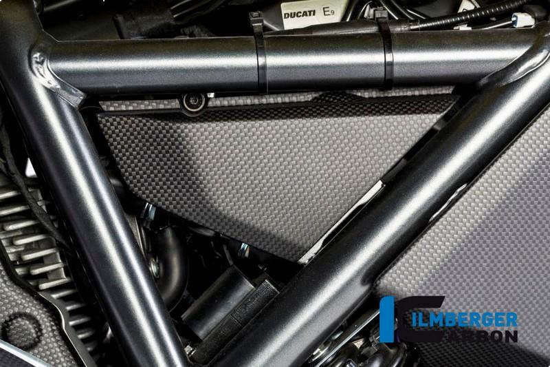 The cover under the Frame for the right side in Carbon with matt surface for the Ducati Scrambler 2016 is a direct replacement for the original component and contributes mainly to weight saving on the motorcycle and a higher stiffness of the parts.