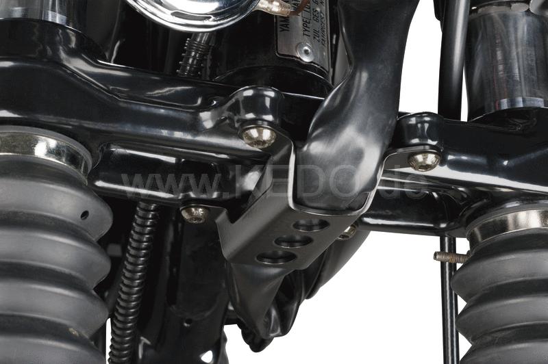 Black aluminum holder with lightening holes, secured with machined aluminum clamps on the fork tube