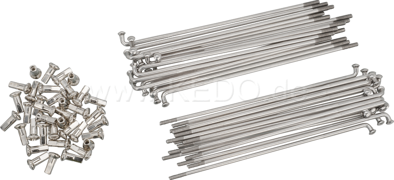 Set contains 36 stainless steel spokes and nickel-plated brass nipples
