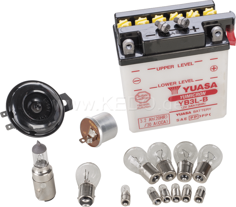 Kedo Add-On Kit Basic for item 50544 PME 12V conversion (contains all 12V bulbs, YUASA battery, flasher relay and horn, OEM headlight remains) | 50550-Y