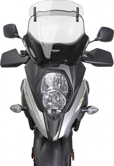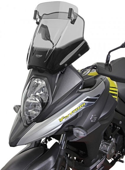 The proven MRA Vario touring screen (VT) with its seven-step adjustable spoiler at the upper end of the screen reduces headwind and turbulence with the airflow channelled through rear of the spoiler. The main screen is 33 cm in length extensible to 41 cm with the spoiler at its highest level to improve the riding experience on a V-Strom.