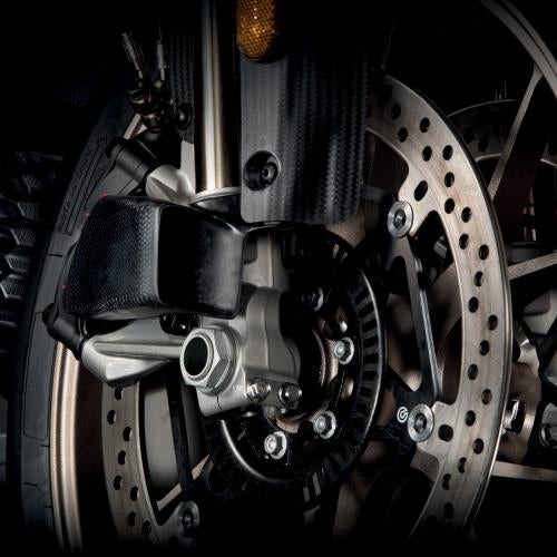 新開発のフロントブレーキ用エアスクープは、冷却効果を高め、ブレーキの挙動を安定させる効果があります。このエアスクープは、MotoGPのノウハウが市販車に直接反映されていることを示しています。カーボンファイバー製で、重量への影響を抑え、高級感を維持しています。