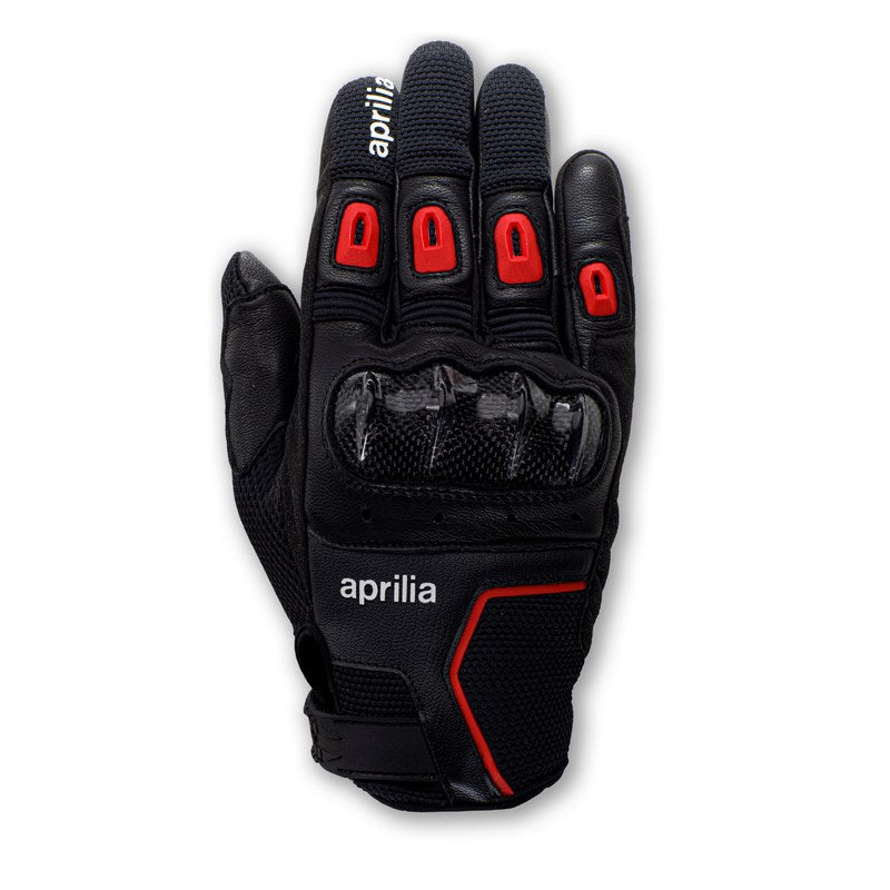 アプリリアのグローブは、道路上でもサーキットでも手を保護するように設計された軽量の高性能グローブです。G-Carbonグローブは、わずか140gの軽量にもかかわらず、EN13594:2015 KP CE認証に準拠しています。ナックルにはカーボンファイバー製のシールドを装備し、安全性を高めています。グローブはHi-Fitゴートスキン(0.6mm~0.8mm)を使用し、部分的に合成スエードを使用することで、耐摩耗性を高めています。手首はベルクロストラップで閉じられ、グローブには素早くフィットするよう特別にデザインされたベロが付いています。背中、手のひら、指にはパッドが入っており、自然な動きを可能にするフレキシブルなパネルが付いています。また、手をドライでクールに保つため、パンチングされたファブリックに通気孔が設けられています。人差し指にはタッチスクリーン用のインサートがあり、グローブを外さずにGPSやスマートフォンなどのデバイスを使用するのに最適です。トップと手のひらにはApriliaのラバーロゴが入っています。