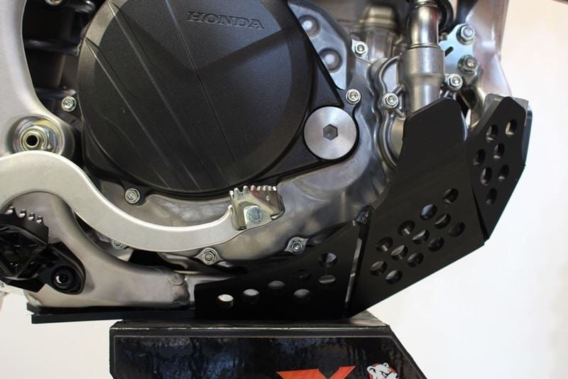 ホンダ4ストローク用スキッドプレート重量 : 1 Kg.HDPE AXPプラスチック製スキッドプレートは、モトクロス、スーパークロス、クラシックエンデューロ用に設計されています。6mm厚のポリエチレン製で、フレームの下側を覆い、エンジンとクランクケースを突起物から保護します。アルミニウムと異なり、HDPEは衝撃を吸収し、変形を受けず、振動を発生させず、40%軽量化されています。エンジンスキッドプレートは消耗品のため、製品の早期破損の場合のみ保証されます。このモデルはHONDA CRF250R - CRF250RX専用です。警告このリファレンスはすべての年式に対応するものではありません。