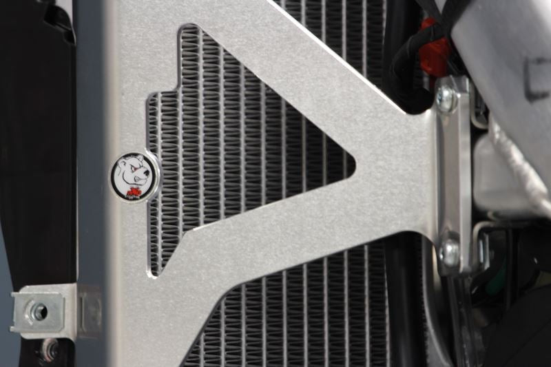 Honda CRF250R / CRF450R ラジエターガード。重量 : 1.1 Kg.4mm厚のアルミ板から切り出され、前2点、後1点の計3点で取り付けられる軽量なラジエーターガード。低速での転倒時にはラジエターを横方向に保護し、高速での衝撃時にはラジエターの巻き戻りを防止するデザインです。ガードには取り付けに必要な金具が両面分付属しています。注:当社のラジエーター補強は、ダメージを最小限に抑えることができます。ラジエーターが変形する可能性がありますが、保証するものではありません。ホンダCRF250R - CRF450R で設計されたモデル。警告、この参照はすべてのモデル年で利用可能ではありません。