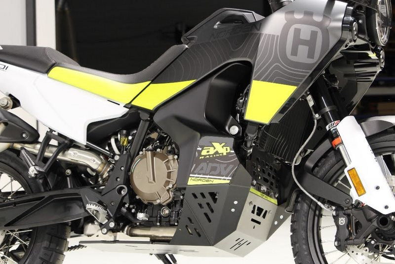 Husqvarna Norden 901 スキッドプレート。HARDバージョン - 3.8Kg - Husqvarna 901 Norden用のAXPバッシュプレートは、激しい衝撃からエンジンブロックとタンクを保護するために開発されました。8mm厚のHDPE(高密度ポリエチレン樹脂)製で、このHARDバージョンは、最大限の抵抗力を得るためにリアに特別な固定システムを使用し、あらゆる損傷を避けるためにエンジンには全く直接リンクしていません。プレートとタンクの間には8mm厚の発泡スチロールが付属しており、摩擦から守ります。ステッカーは付属していますが、スキッドプレートに貼り付けることはできません。マッドガードはパッケージに含まれており、冷却に影響を与えることなく、バッシュプレートから最大限のゴミを排出することができます。合金製と比較した場合の利点は?軽量で静か、プラスチックは振動を起こさず、衝撃の後でも変形しないので、メンテナンスが必要になったときにも安心です。注意:このモデルはセンタースタンドに対応していません。センタースタンドをご希望の場合は、ADVENTUREページで販売しているTOURINGバージョンをご覧ください。クラッシュバーには対応していません。