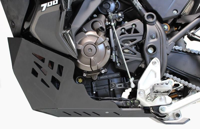 アドベンチャー用スキッドプレート Tenere 700 World Raid - Weight : 3.1Kg .フレームチューブ、リンケージ、サイドスタンドセンサー、ケースを保護するバッシュプレートです。8mm厚の高密度ポリエチレン樹脂製で、合金製の同様の製品に比べ30〜40%軽量でありながら、強化された保護性能を提供します。アルミ製のバッシュプレートに比べ、衝撃音が小さく、振動がなく、変形もしない。メンテナンスもしやすく、快適にお使いいただけます。このスキッドプレートは、市販のクラッシュバーには適合しません(若干の加工が必要です)。センタースタンドは装着可能ですが、スキッドプレート後部を若干カットする必要があります。ヤマハテネレ700ワールドレイドのみ装着可能です。