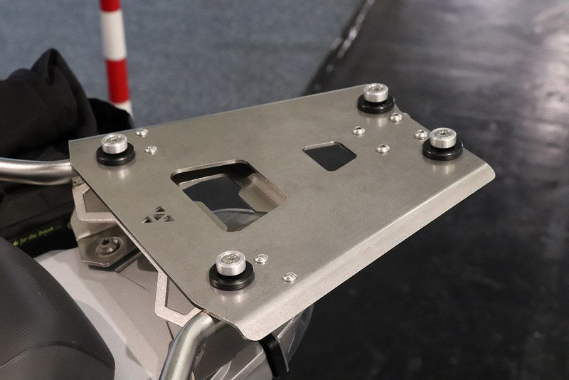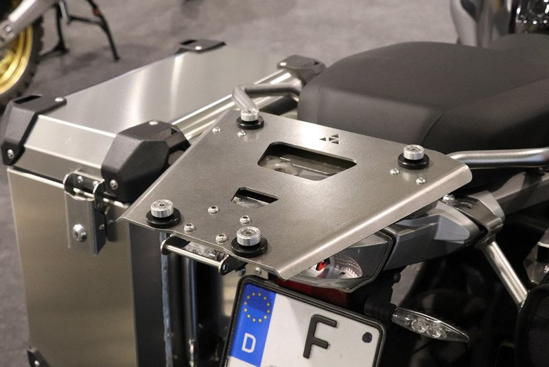 The BUMOT Defender EVO top case mounting plate for 2014 + R1200GS Adventure is made from 3mm stainless steel and provides quick release functionality to install a BUMOT Defender EVO 30L or 43L top case. All hardware to install the top case mount to the OEM BMW rear rack, as well as mount the top case to the mounting plate is included.