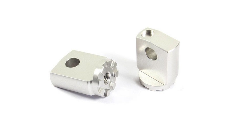 バリオフットレストシステム(ジョイント)は、オリジナルのフットペグと同様にバイクに装着します。バリオプレート(アダプター)をジョイントに、フットペグをバリオプレートに装着します。スーパーグリップフットレスト、レーシングフットレスト、マルチグリップフットレストのみ使用可能です。オリジナルのフットレストは使用できません。バリオプレートは45度ごとに固定することができます。写真2、3、4は、フットペグを下げるためのパーツです(3つのパーツはすべて別々に注文する必要があります!)。ジョイントはEUホモロゲーションに対応したシルバーアルマイト仕上げです。