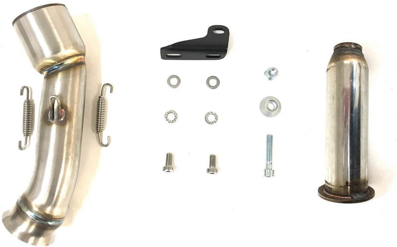 サテンマット仕上げのAISI304ステンレススチール製の円錐形サイレンサー。円錐形のエンドキャップは高温のカーボンファイバー・エポキシ樹脂製で、光沢仕上げ。