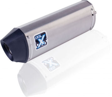 サテンポリッシュ仕上げのAISI304ステンレス製サイレンサー。非対称で円錐形のエンドキャップは高温ブラックラッカー仕上げのアルミニウム製。