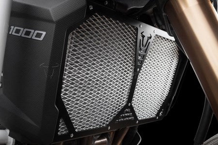 レーザーカットパターンのアルミ合金製ラジエーターガード。効率的なストーンチッププロテクション。ブラックパウダーコート仕上げ。メッシュはシルバーまたはブラック。