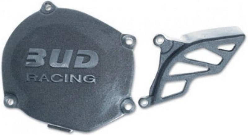 KX85用イグニッションカバーとフロントスプロケットガード。強力な合金製で、Bud Racingのロゴが入っています。合金製チェーンガード付き。
