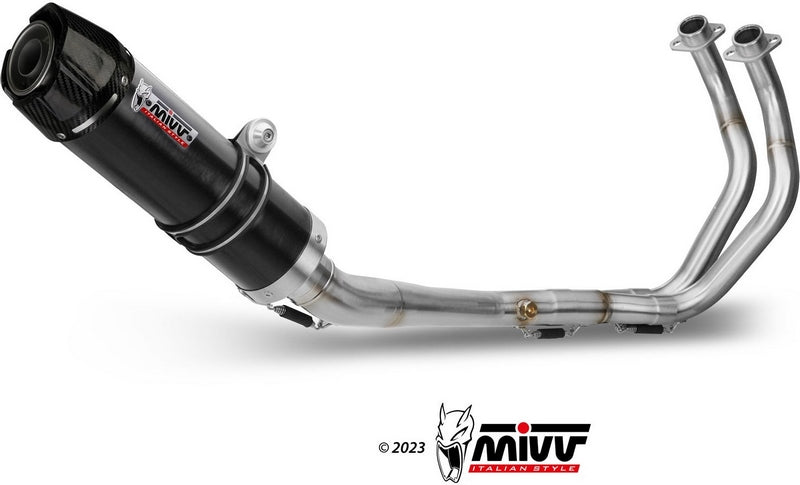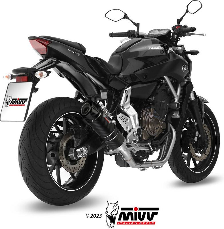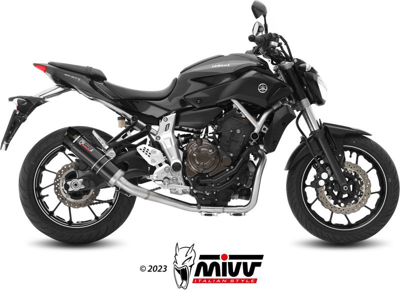 Designed to improve the aestethics, sound and performance of the bike, Mivv slip-on exhausts are the result of maximum attention to design, with the aim of satisfying those who want to distinguish themselves by the look of their motorbikes.Manufactured implementing the technical solutions of competition models, the GP exhaust is a round short silencer with widened outlet.This exhaust features a central body made of black stainless steel “Black Moon” effect, obtained with a special colouring process that provides a more aggressive look to the silencer.