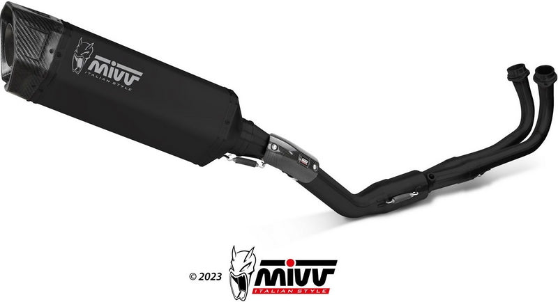 Designed to improve the aestethics, sound and performance of the bike, Mivv slip-on exhausts are the result of maximum attention to design, with the aim of satisfying those who want to distinguish themselves by the look of their motorbikes.The exhausts of the SR-1 line are mainly dedicated to superbikes and hypernaked. SR-1 inherits all the experience gained in Motogp - Moto2 - Moto3 world championships. Finished with great attention to detail, it guarantees an improvement in the look and performance of the bike.It features a central body in black stainless steel with “Black Moon” effect, obtained thanks to a special ceramic-based painting process that gives the product a more aggressive look.