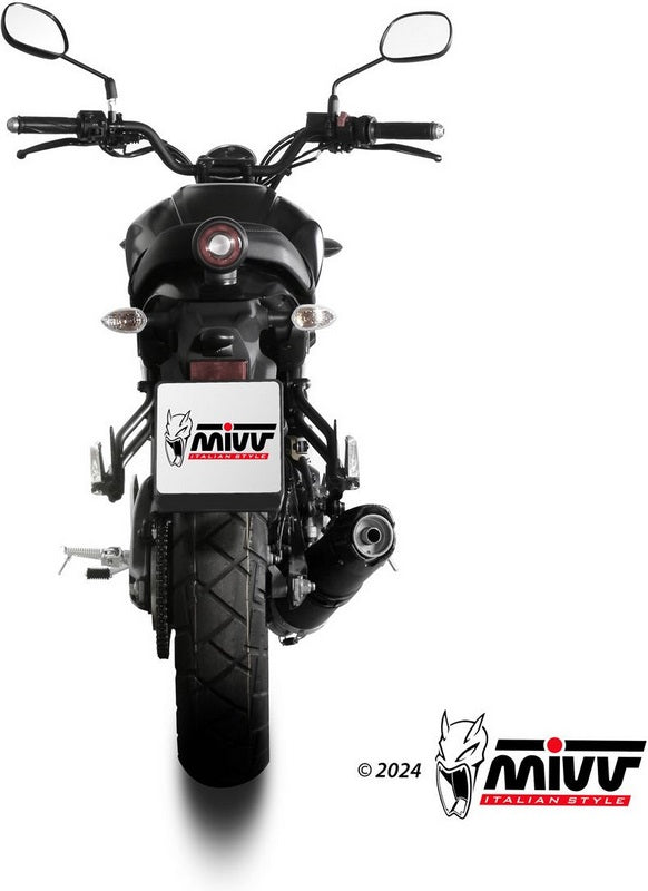Designed to improve the aestethics, sound and performance of the bike, Mivv slip-on exhausts are the result of maximum attention to design, with the aim of satisfying those who want to distinguish themselves by the look of their motorbikes.Manufactured implementing the technical solutions of competition models, the GP exhaust is a round short silencer with widened outlet.The central body is made of carbon, a material that gives lightness and sportiness to the silencer.