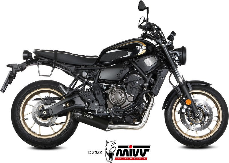Designed to improve the aestethics, sound and performance of the bike, Mivv slip-on exhausts are the result of maximum attention to design, with the aim of satisfying those who want to distinguish themselves by the look of their motorbikes.The exhausts of the HR-1 line have a round shape assembled with special look black rivets. The outlet end cap is available in ceramic black painted aluminum or in "twill 3K look" carbon It features a central body in black stainless steel with “Black Moon” effect, obtained thanks to a special ceramic-based painting process that gives the product a more "classic style " look.