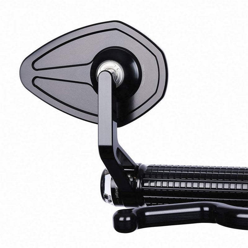 ミラー本体、ミラーアーム、ハンドルバーエンドのクランプは、無垢のアルミニウムからCNCマシンでフライス加工され、高品質のアルマイト処理が施されています。すべてのネジはステンレス製です。精密なボールジョイントにより、快適で非常に安定したミラーの調整が可能です。ハンドルバーエンドミラーのMo.viewフライトは、小型でコンパクトなデザインです。バーエンドインジケーターやmo.グリップ、プッシュボタンコントロールmo.switchやmo.switch miniにぴったりフィットします。ハンドルの上にも下にも取り付けられる。ミラーは左右どちらでも使用可能。ハンドルバーエンドに22mmまたは1インチで直接取り付けるか、グリップやコントロールを動かせない場合は、mo.viewバーアダプターを使用します。mo.viewフライトのミラー面のサイズはEU法に対応しています。ミラー面のサイズはEU法に対応しています。