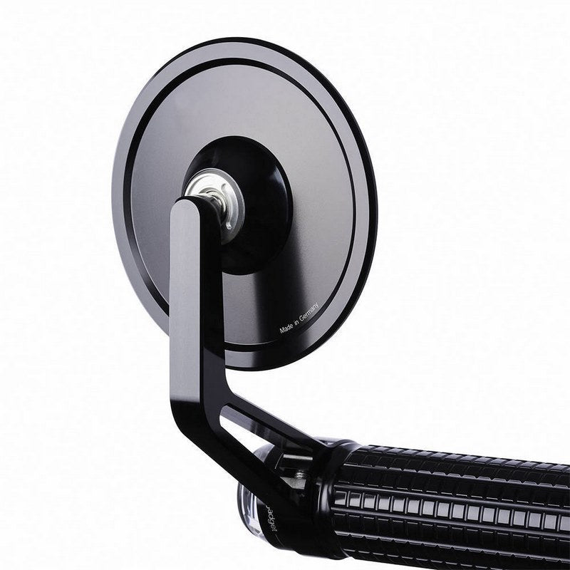 ミラー本体、ミラーアーム、ハンドルバーエンドのクランプは、無垢のアルミニウムからCNCマシンでフライス加工され、高品質のアルマイト処理が施されています。すべてのネジはステンレス製です。ハンドルバーエンドミラーのmo.view cafeは非常に小さく、バーエンドインジケーターやグリップmo.glip、プッシュボタンコントロールmo.switchやmo.switch miniに完璧にフィットします。ハンドルの上にも下にも取り付けられます。ミラーは左右どちらでも使用可能。ハンドルバーエンドに22mmまたは1インチで直接取り付けるか、グリップやコントロールを動かせない場合は、mo.viewバーアダプターを使用します。mo.view cafeのミラー面のサイズはEU法に対応しています。