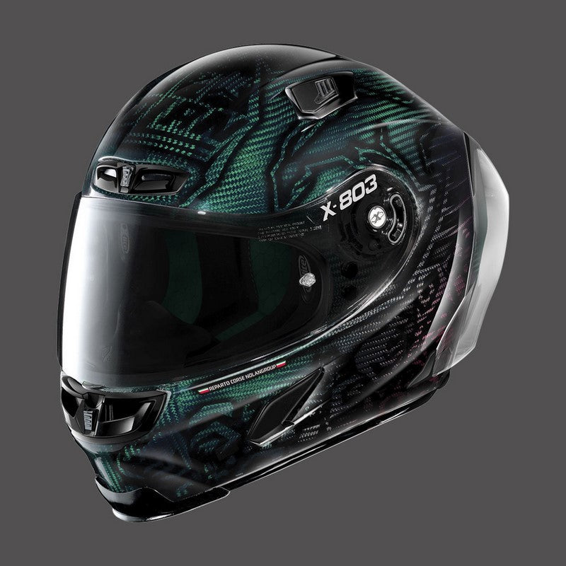 -NOLAN Emergency Release System)、ダブルアクションシステムによる信頼性の高いバイザー機構、効率的なRAF(Racing Air Flow)ベンチレーションシステム、カーボンフィッティングレーシングエクスペリエンスインナーコンフォートパッド(革新的なネット構造を採用)などが挙げられます。X-803 RS ULTRA CARBONは、レーストラックでの経験を最大限に楽しみたいモーターサイクリストのための、最も高級なレーシングフルフェイスヘルメットとして発表されました。