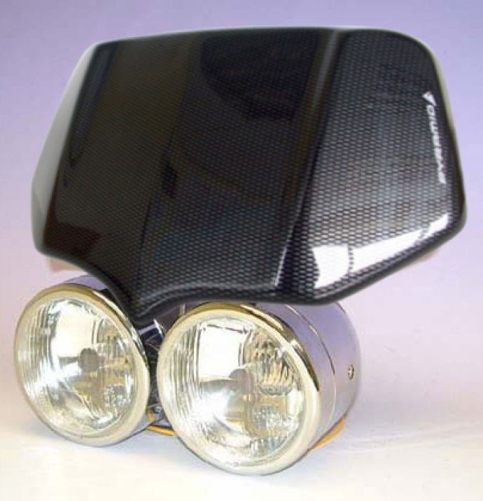 Dominatorツインヘッドライト用のフライスクリーンです。 2つのライトの間にボルトで固定する簡単なブラケットが付属しています。 これはフライスクリーンのみです。