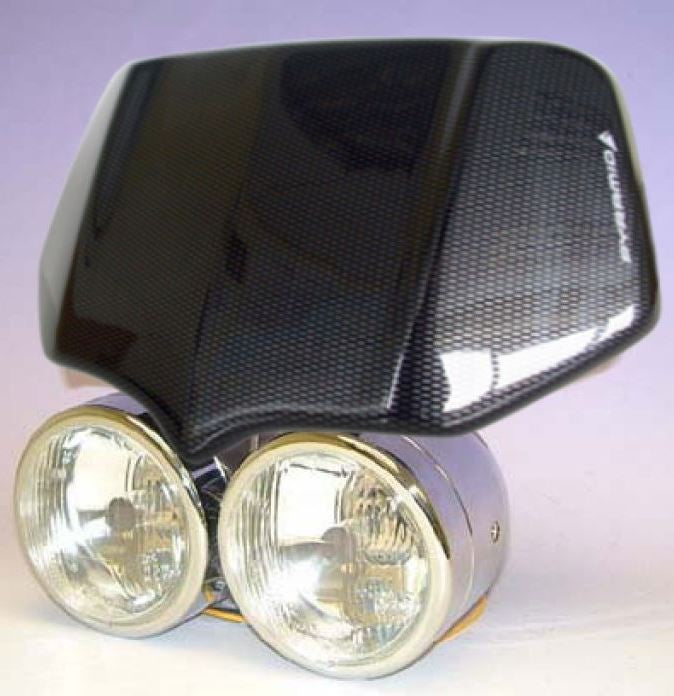 Dominatorツインヘッドライト用のフライスクリーンです。 2つのライトの間にボルトで固定する簡単なブラケットが付属しています。 これはフライスクリーンのみです。