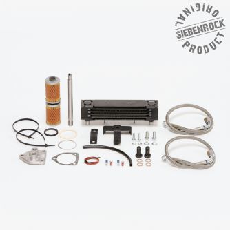 Oil cooler kit centered for BMW R2V Boxer models G/S,ST/GS/R80R R100R. To perfectly lubricate an engine under load and to absorb the considerable thermal effects of city driving or over rough terrain, the engine oil should be kept constantly at the optimum temperature. The Siebenrock Oil Cooler Kit provides exactly this facility. The light alloy cooler is fitted below the steering head so that it is protected in the case of a crash. The system provides the optimum supplement to the Siebenrock Power Kit or the Replacement Kit. In addition to the cooler itself, the following are supplied: an oil filter, a complete gasket fitting set, including high-quality pipes and all necessary attachment parts. We recommend the use of an thermostat (art. no. 1142301) that enables a healthy warm-up phase (starts to open at 90 degrees; full flow at 110 degrees).