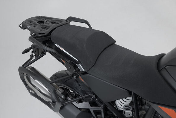 アドベンチャーセットラゲージには、PROサイドキャリアと、KTM 1290スーパーアドベンチャーとお揃いのADVENTURE-RACKが含まれています。サイドキャリアとラックは、バイク専用のアタッチメントポイントに固定され、ブラックのTRAX ADVアルミケースを頑丈にサポートします。