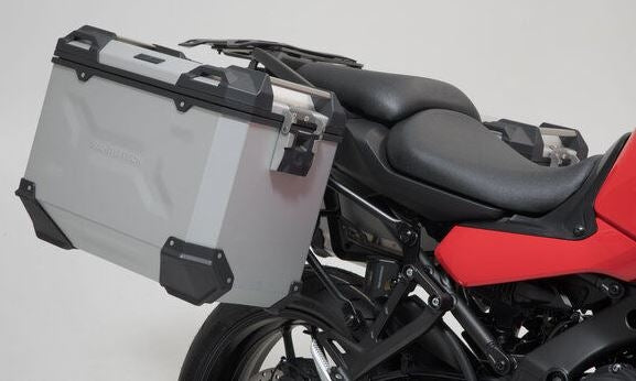 アドベンチャーセットラゲージは、ヤマハトレーサー9に適合するPROサイドキャリアと、適合するADVENTURE-RACKのセットです。サイドキャリアとラックは、バイク専用のアタッチメントポイントに取り付けられ、シルバーのTRAX ADVアルミケースをしっかりとホールドします。