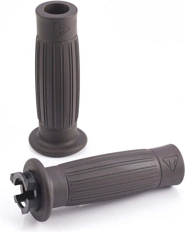 控えめなTriumphロゴが特徴の成形式のラバーバレル型ブラウンハンドルバーグリップ一式です。