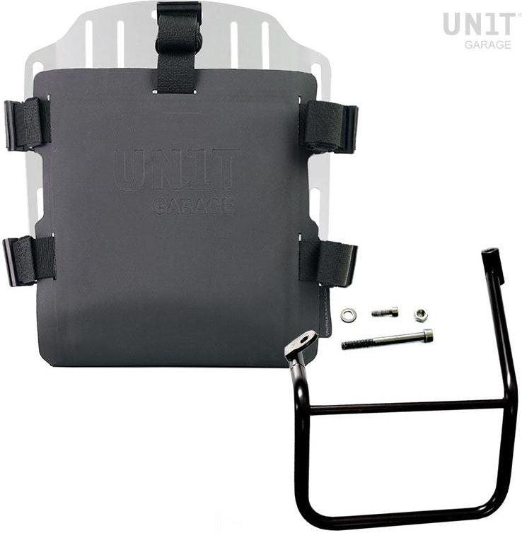 調整可能なハイパロンフロントを備えたアルミ製キャリングシステム。クイックリリースシステムcod.U000が付属しており、プレート背面に取り付けることで、パニアサブフレームに素早く取り付けることができます。付属のキーを使ってクイックリリース・システムを閉じ、キャリングシステムをフレームにロックすることができます。このプレートは、バイクのサイドにフラットな取り付け面を作り、寝袋やジャケットなど、さまざまなタイプのバッグやその他のオブジェクトの運搬を可能にします。ハイパロン製のフロントフラップは、付属のスライダーで調整でき、プレートから素早く取り外すことができます。