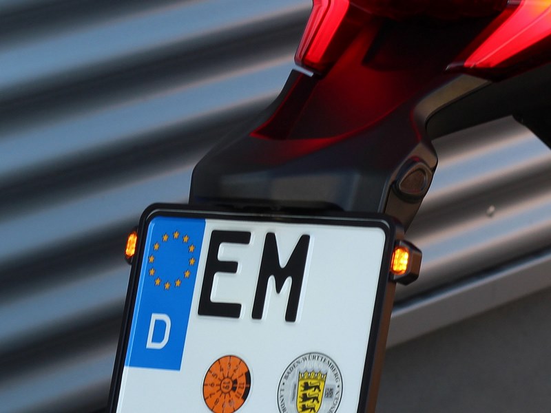 - ナンバープレートフレームのベースプレートに2つの小さな穴を開けるだけで、ターンシグナルを簡単に後付けできます。穴はすでにマークされています。