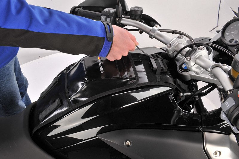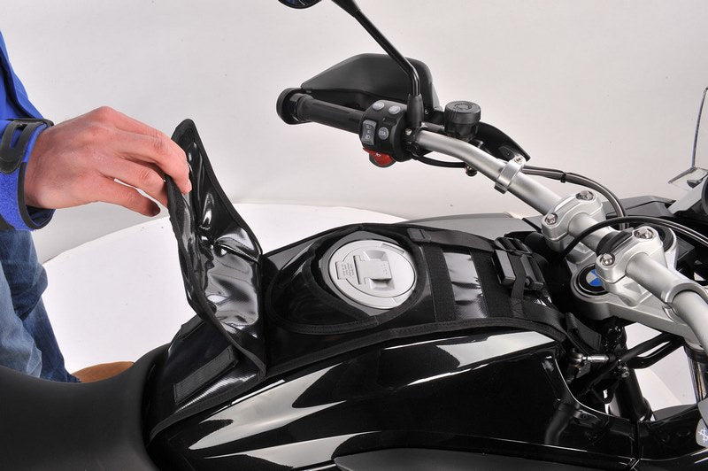 この新しいタンクバッグは、まずタンクに取り付けられる強固なベースを特徴としています。タンクバッグは、ベースプレートにスライドするベロを使って、素早く簡単にベースプレートに取り付けられます。