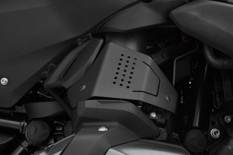 インジェクターチューブ、ライン接続部、スロットルセンサーを含むインテークパイプ周りを保護するフューエルインジェクションシステム用カバーです。コネクターからの漏れは常に問題となっています。これはブーツやズボンにラインが引っかかることで起こり、厄介な故障の原因となります。粉体塗装されたアルミニウム製のカバーは、インジェクションシステムの部品を効果的に保護し、システムやコネクターの操作からも保護します。