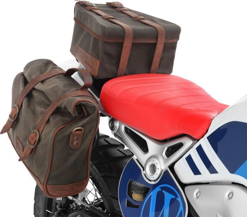ワックス加工されたコットン製のスタイリッシュなサドルバッグ。"Rallye "パッセンジャー・ラゲッジ・キャリアに取り付けるために特別に作られました。実用的で魅力的なラゲッジソリューションであり、BMWに魅力的でカジュアルな印象を与えます。