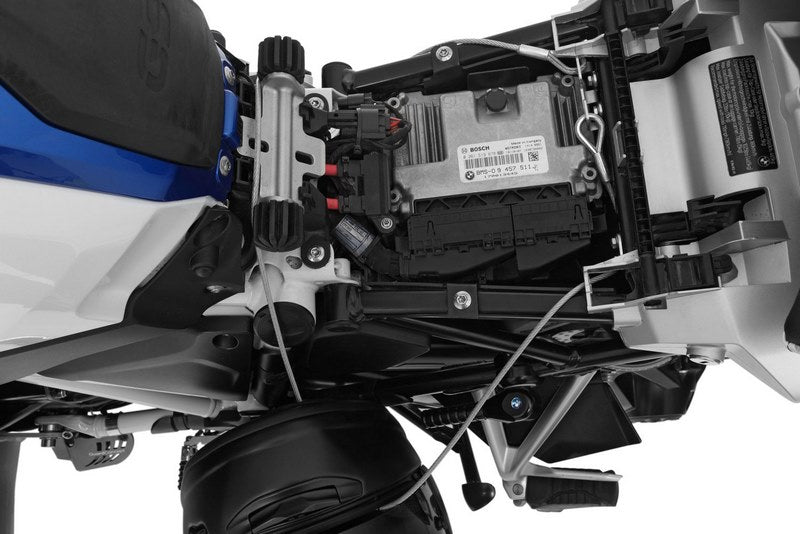 R 1250 GS用の安全で使いやすいハンディタイプのヘルメットロックです。スチールコードは助手席の下に取り付けられ、スプリングで支えられたバーでも固定されています。ループは非常に頑丈にプレスされています。そのため、シートを引き上げなければループを開くことができません。