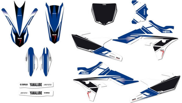 ヤマハの本格的なオフロードレーシンググラフィックを使用したステッカーのセットです。キットには、フロントフェンダー、リアフェンダー、スイングアーム、シュラウド、ナンバーシールドフロント、ナンバーシールドサイドコンプリート、フューエルタンクサイド、フューエルタンクトップ、フォークプロテクターのステッカーが含まれています。