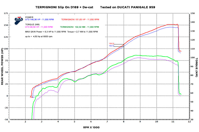 SILENCER Termignoni introduces the new homologated silencer for Ducati Panigale 959 (Model Year 2016-2018)The exhaust is characterized by the carbon sleeve, rear carbon cap with the exclusive “Force” design.Apart from it is possible sell the final body de-cat code D16909430IXX, developed to give the best of performance.In terms of performance with the final body de-cat it offers:an increase of power ( + 6,27 Hp at 11.000 rpm) and torque (+ 2,76 Nm at 11.000 rpm).CARBON
