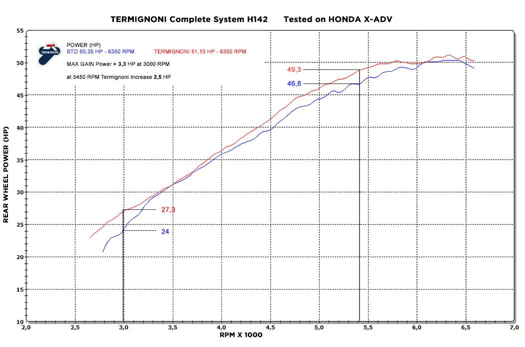 HEADER Termignoni introduces the racing header, code H142, matched to slip-on silencer H142IXX, for the HONDA X-ADV (Model Year 2017-2018).The header is characterized by the main structure in stainless steel and designed to offer an even more powerful driving experience.Only the header offers a reduce of weight (– 2,500 kilos)In terms of performance it offers: an increase of power ( + 2,4 HP at 5.450 rpm) and max gain +3,3 HP at 3,000 rpm. Stainless steel