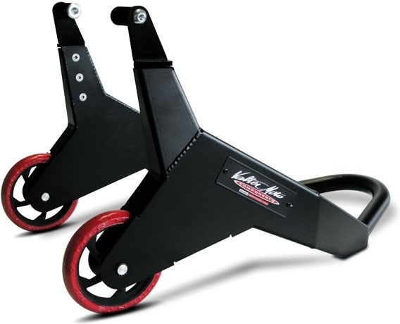 VMC PRO LINE Steel boxed frame front stand made from a steel sheet bent and handcrafted welded equipped with two red/black large wheels VMC designed. Developed to lift bike from front radial calipers.