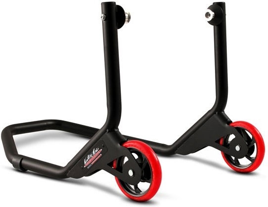 This model of Race Endurance rear stand is made with steel and painted with a special embossed long life powder coating. Is equipped with two red/black large wheels VMC designed. It must be used with special forks adapters mounted on rear bike swingarm and the width can be manually adjusted to fit with all racing bikes.