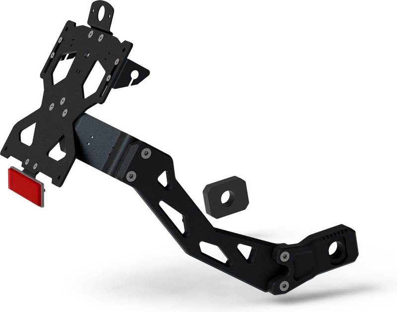 King license plate holder is made to change license plate holder position down on the rear wheel. Available in black color.